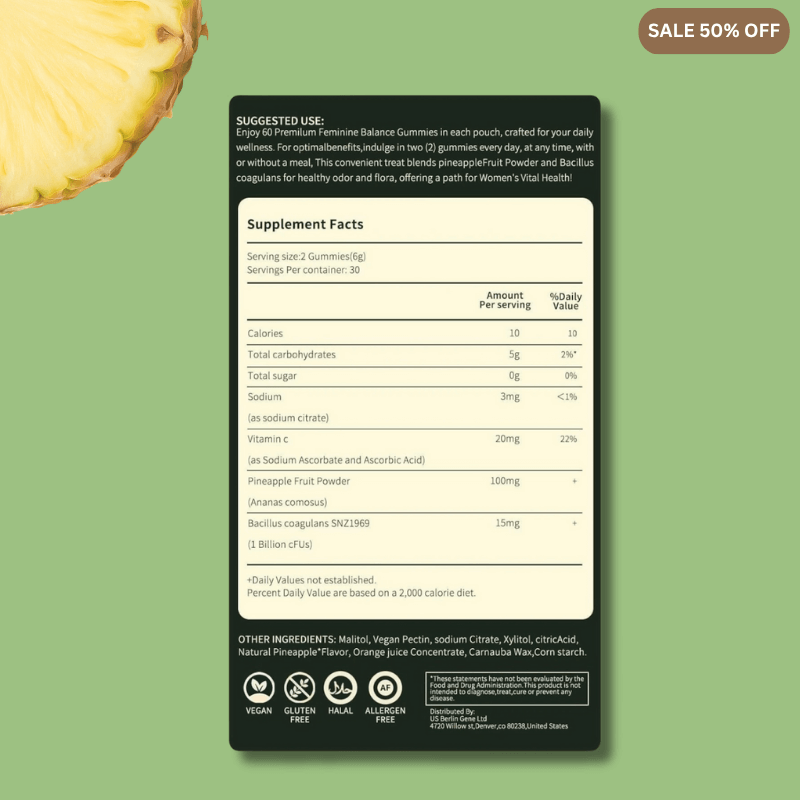 Formulated with probiotics, pineapple extract, and pH-supporting nutrients, these delicious gummies naturally support vaginal health, odor control, and inner harmony — all in one sweet, tropical bite.