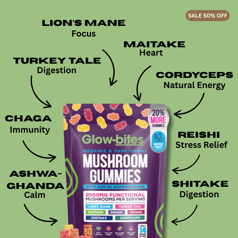 Glow-bites™ Super Mushroom Gummies contain a blend of7 functional mushrooms— Lion’s Mane, Reishi, Cordyceps, Chaga, Tremella, Maitake & Shiitake — combined with natural ingredients for a delicious daily ritual.